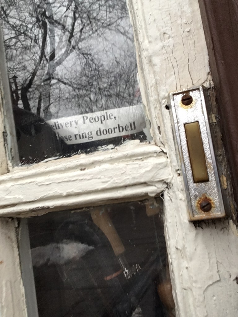 Increasingly, I’m noticing that people coming to the house, seeking my attention, ignore the doorbell (which is just to the right of the door) in favor of knocking on the door. Mind you, that’s the outer door. There’s also a thick, insulated inner door. The only reason I knew there was someone knocking just now is that I opened the insulated door to see if the mail had been delivered yet, and saw something blue and billowy through the windows in the door (yes, you can look through the front door to see that it fronts on a vestibule which has a thicker door farther in). Had I not opened that door, the fellow holding that blue umbrella would have been knocking in vain. (It turns out he was canvassing for signatures on a petition, but wasn’t terribly clear about the purpose of the petition, so I declined to sign.)