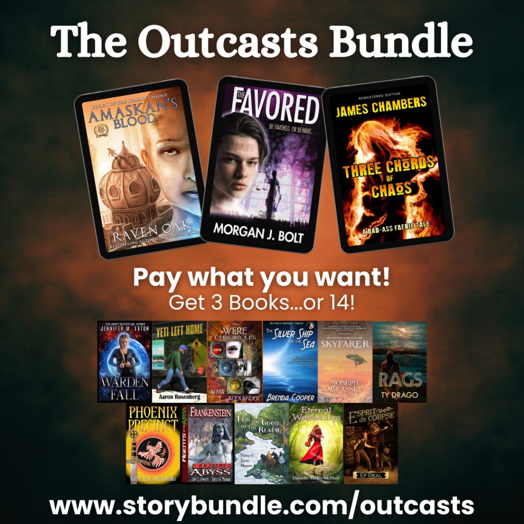 Our authors have taken the outcasts and woven masterful tales of triumph despite adversity. In these times of turmoil, we all need a reminder that such difficulties can be overcome. Check out the Outcasts bundle, which I hope you will enjoy as much as I have. At the least you will get three amazing books for a steal, Amaskan’s Blood by Raven Oak, The Favored by Morgan Bolt, and Three Chords of Chaos by James Chambers. At most, you’ll score not just the three base books plus eleven bonus titles, but two bonus-bonus books thanks to Alma Alexander’s radically awesome reenvisioning of shapeshifters and her generous inclusion of her Were Chronicles Omnibus, which includes the full trilogy Random, Wolf, and Shifter
