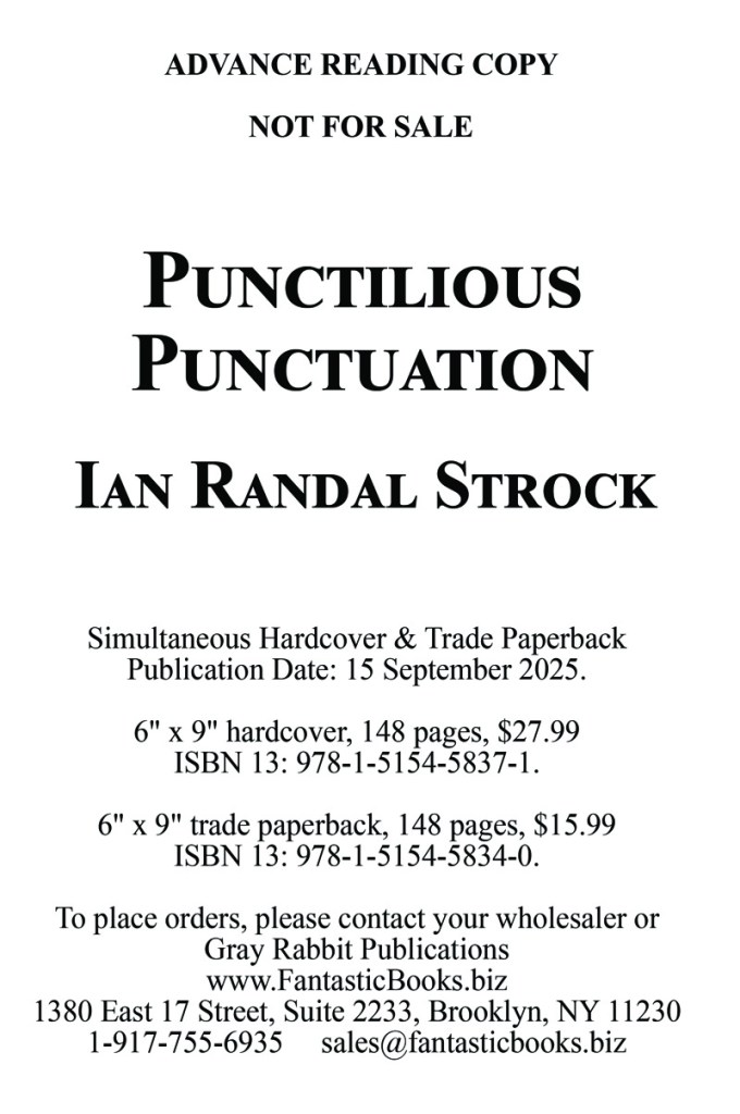 Punctilious Punctuation: Telling tales with (and of) those jots and tittles, including why they’re called jots and tittles, and the horrifying story of why the period goes inside the quotation marks by Ian Randal Strock 148 pages, fully illustrated September 15, 2025 Trade Paperback: ISBN: 978-1-5154-5834-0, $15.99 Case Laminate (library binding): ISBN: 978-1-5154-5837-1, $27.99